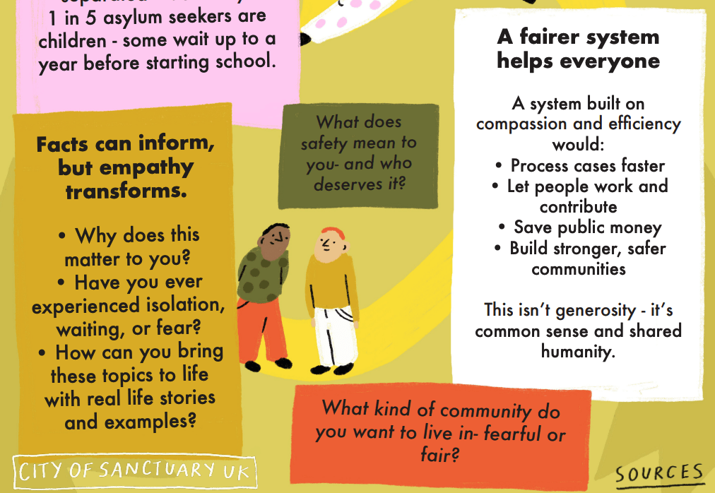 The Facts about Sanctuary provides clear, accessible information about people seeking sanctuary in the UK. But facts alone don’t change hearts and minds. This guide encourages you to bring your own thoughts, experiences, and humanity into the conversation – because connection is what truly transforms understanding.