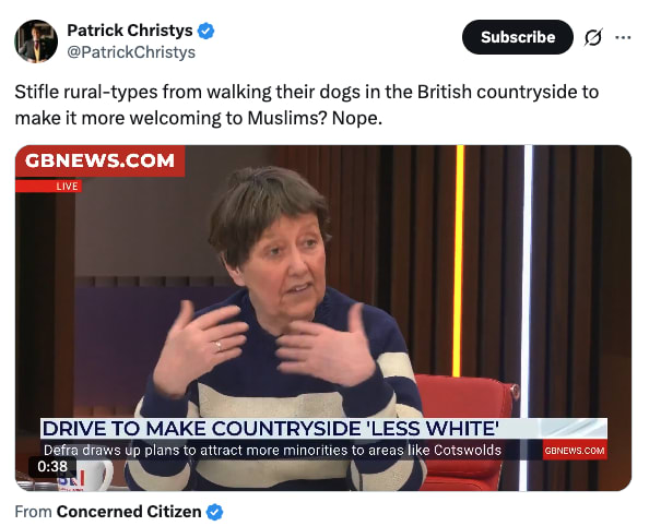 Earlier in February GB News commentator Scarlett MccGwire suggested “one of the problems is dogs” when it comes to making the countryside more inclusive, before touching on “the fact that a lot of Muslims find dogs very difficult”. Clip here.