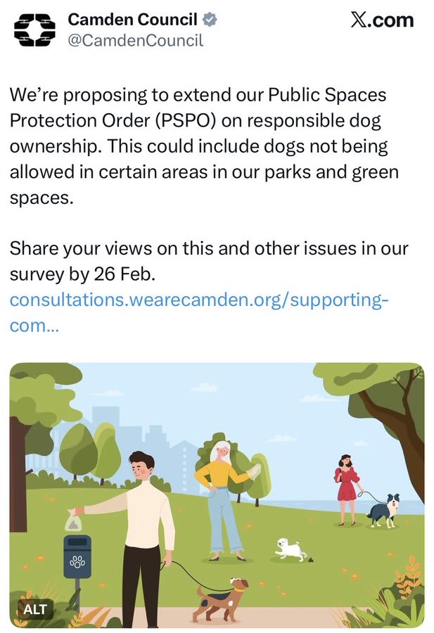 Yesterday, in a now-deleted tweet, Camden Council launched a consultation on “responsible dog ownership”. The Council is proposing to extend its Public Spaces Protection Order, which could mean “dogs not being allowed in certain areas in [Camden’s] parks and green spaces”.