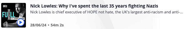 Others to have been on Full Disclosure include Ed Miliband, Tony Blair, Gary Stevenson, Sayeeda Warsi, Bernie Sanders, Humza Yousaf, Ed Davey, Dale Vince, Polly Toynbee, Alastair Campbell, Terry Christian, Emily Maitlis, John Cleese, Chris Bryant, The Secret Barrister, Eddie Marsan, Jonathan Pie, Keir Starmer, Feargal Sharkey, Stewart Lee, Kim Leadbeater, Joylon Maugham, Joe Lycett, Peter Oborne, Owen Jones, Nish Kumar, Billy Bragg and Nick Lowles…