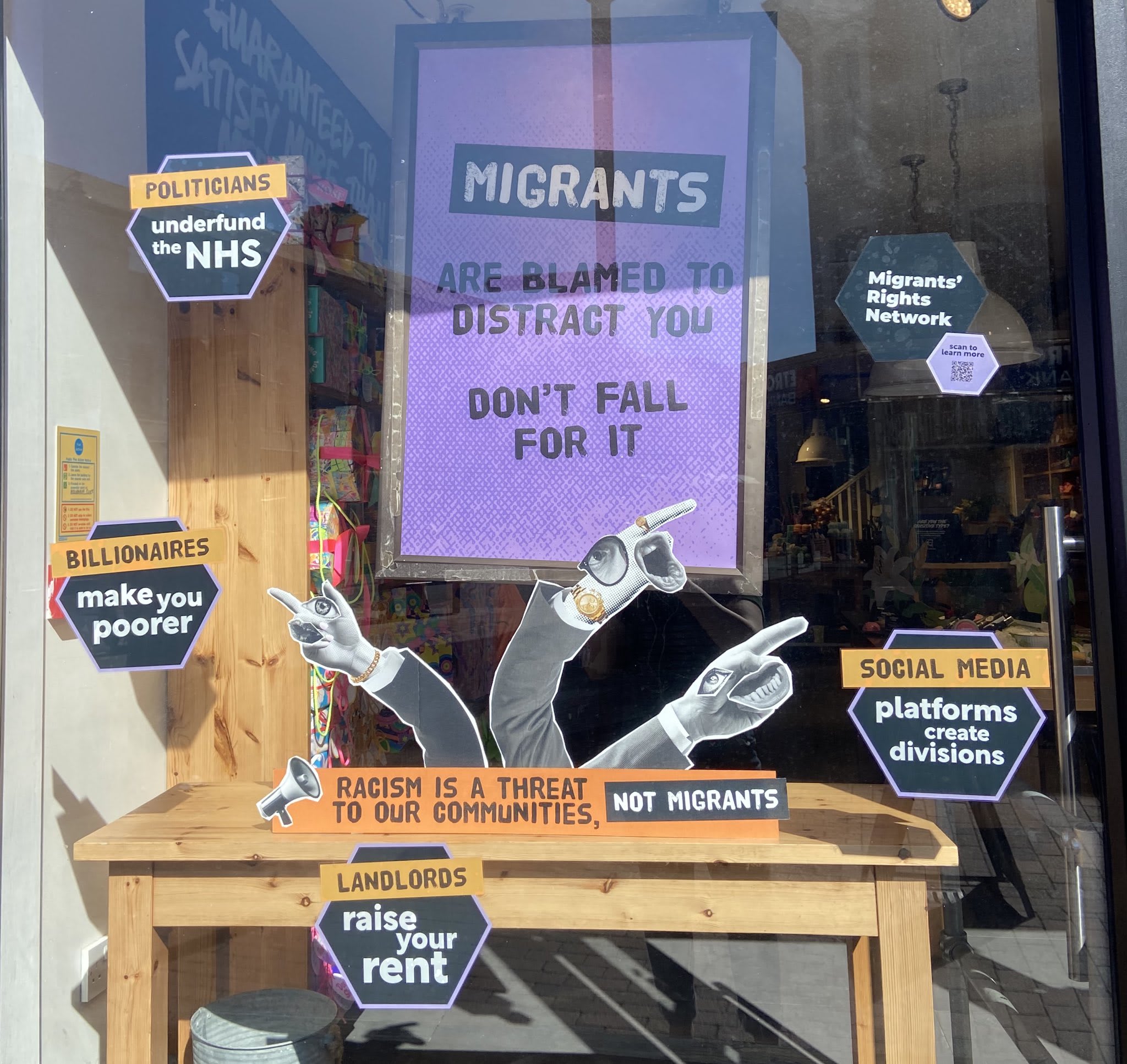 Interestingly on the top right of the store window it reads “Migrants’ Rights Network”, which is a “UK charity that stands in solidarity with all migrants in their fights for rights and justice.”