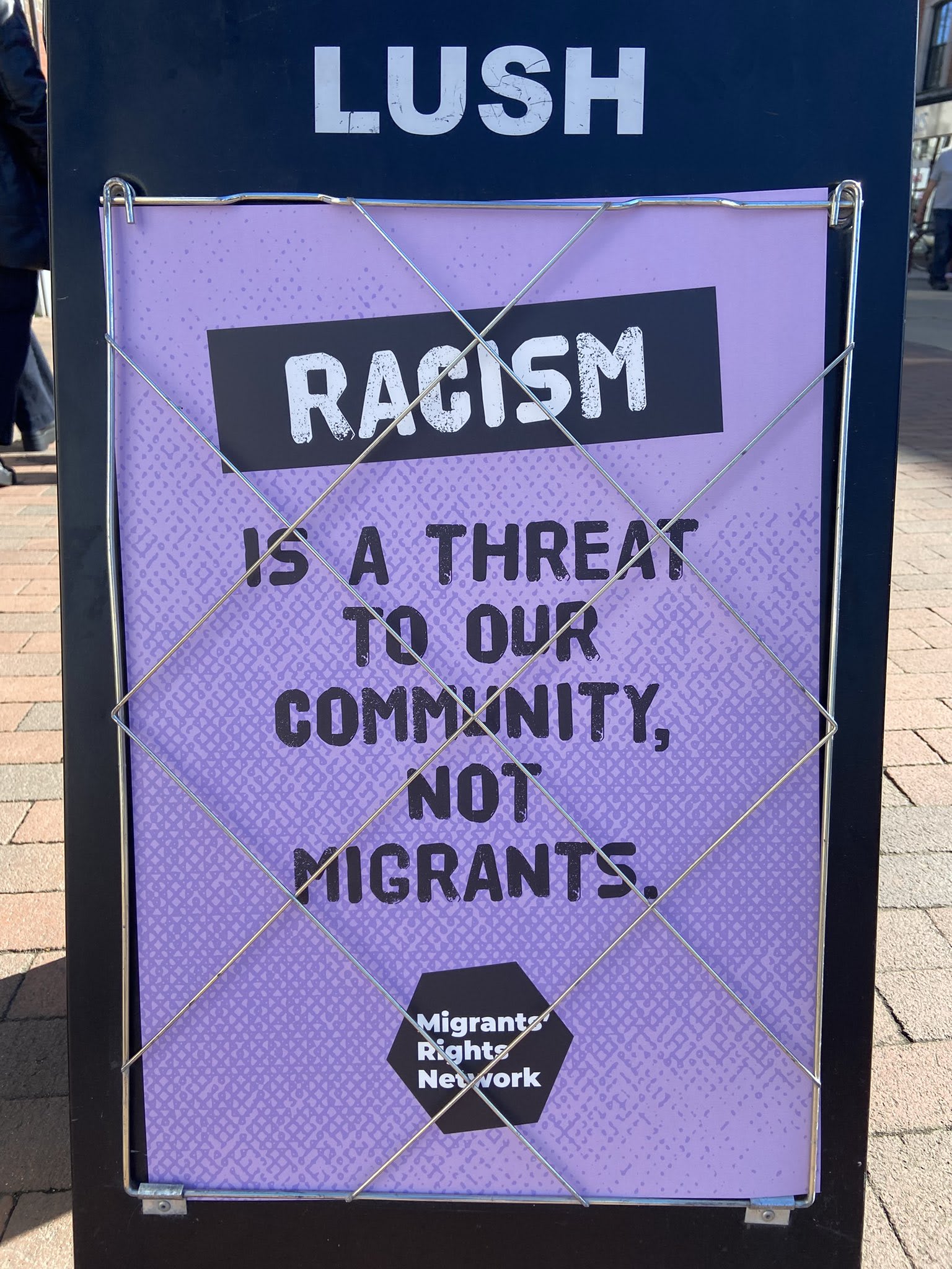 The other day I spotted this rather hostile sign outside my local Lush. “Racism is a threat to our community, not migrants”, it reads.