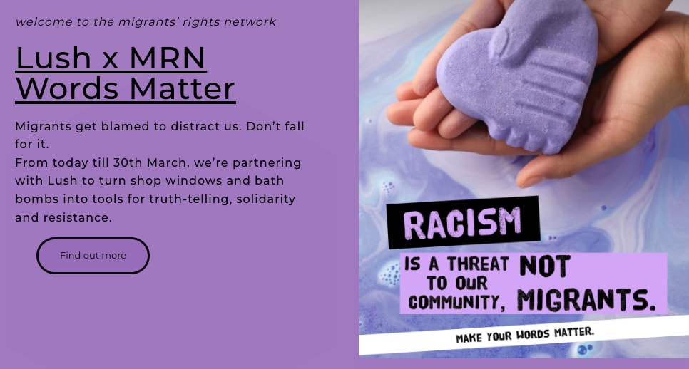 From March 16 to 30, Migrants’ Rights Network is “partnering with Lush for a nationwide public awareness and fundraising charity campaign calling out the growing use of racist narratives to divide our communities and distract from the real issues people face across the UK.”