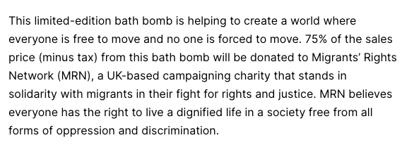 Lush says “This limited-edition bath bomb is helping to create a world where everyone is free to move and no one is forced to move.”