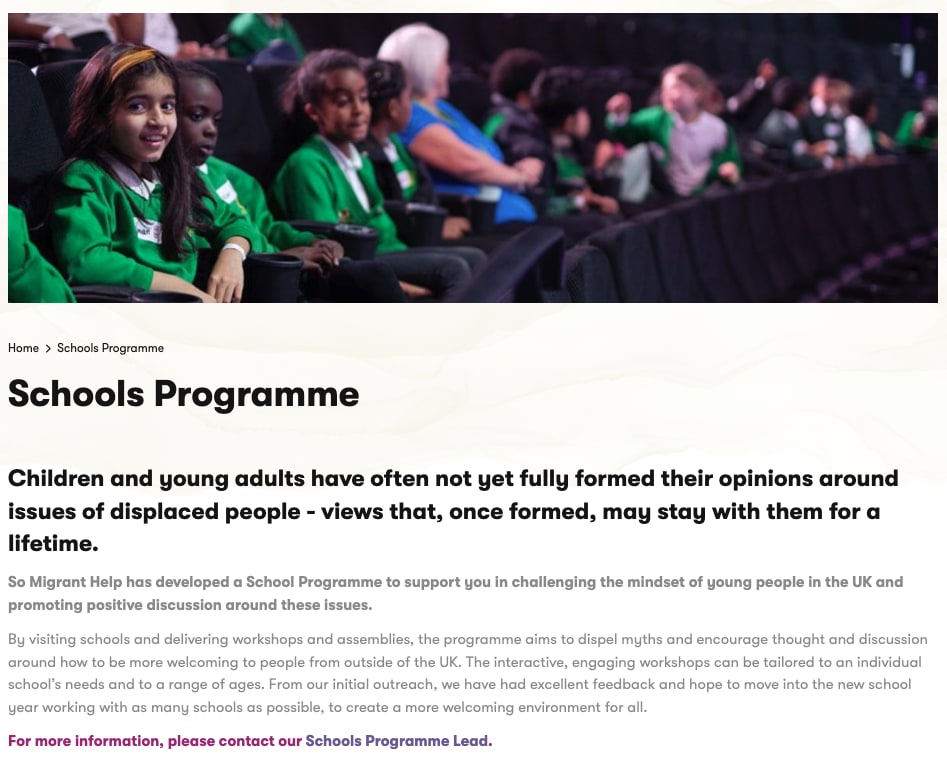 In addition to its main services, Migrant Help has a “Schools Programme”: