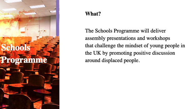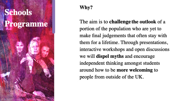 Migrant Help says that children and young adults “have not yet fully formed their opinions around issues of displaced people”. Therefore it has “developed a School Programme to support you in challenging the mindset of young people in the UK and promoting positive discussion around these issues.” The programme aims to “dispel myths and encourage thought and discussion around how to be more welcoming to people from outside of the UK.”