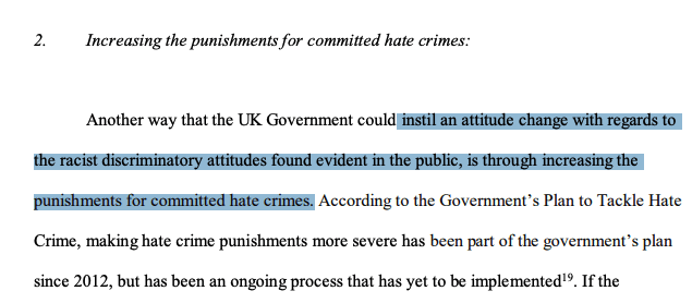 One report on its website, titled Deconstructing Racist Narratives and Discrimination in the United Kingdom, suggests the Government “could instil an attitude change with regards to the racist discriminatory attitudes found evident in the public… through increasing the punishments for committed hate crimes”…