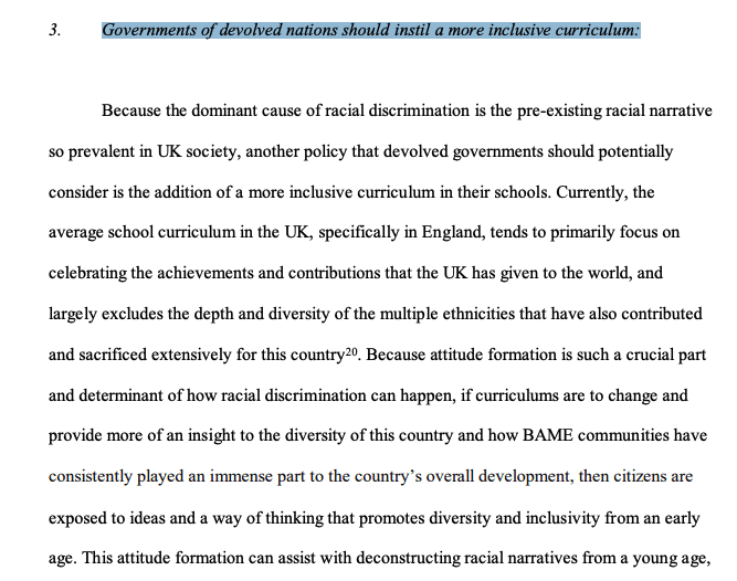 … and that “Governments of devolved nations should instil a more inclusive curriculum” to help with “deconstructing racial narratives from a young age”: