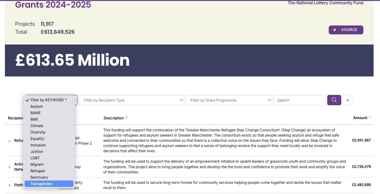 I clicked on TNLCF Grants 2024-25, and then chose “Transgender” from the dropdown menu. Our search tool is quite crude but incredibly useful for identifying woke waste (given we are combing through masses of data):