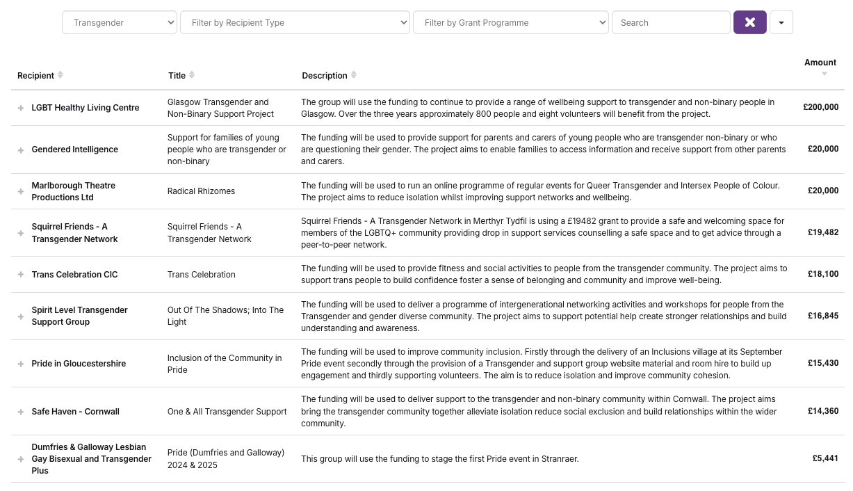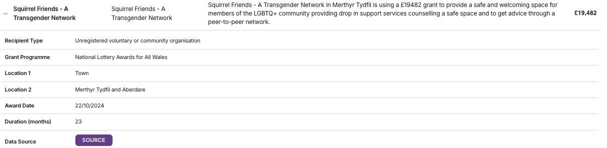 Below I have highlighted a £19,482 grant that went towards “Squirrel Friends – A Transgender Network”: