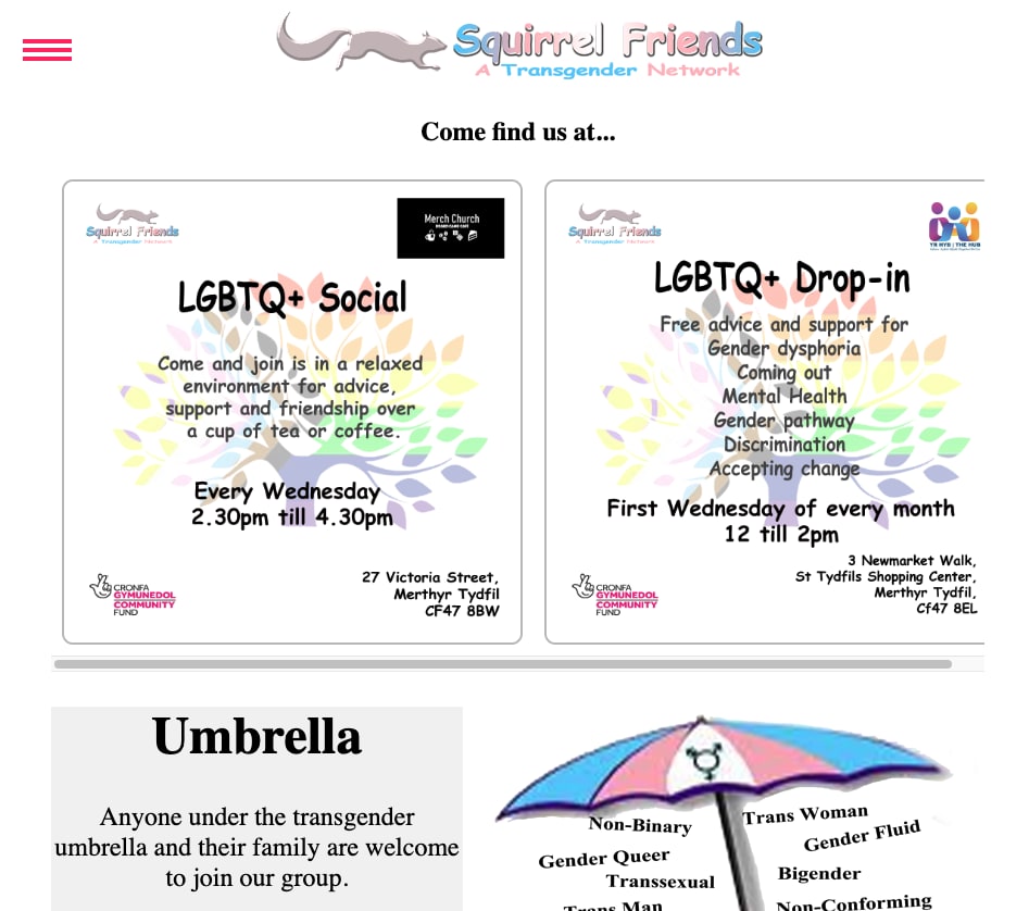 On its website, Squirrel Friends says it’s a “Peer-to-Peer support group founded by three trans women from South Wales, with the aim to provide a safe and engaging place for anyone within the UK who needs support with their gender identity issues, as well as family members who may be having difficulty understanding their loved one or who just need support themselves. We were later joined by another to become what the members refer to as the Elder Squirrels.”